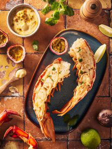 - Langouste cuite : il est plus simple de la couper après cuisson. Séparez la queue et les pinces ou coupez-la en deux pour servir directement. La chair est prête à être dégustée telle quelle ou accompagnée d’un beurre à l’ail ou d’une sauce légère.